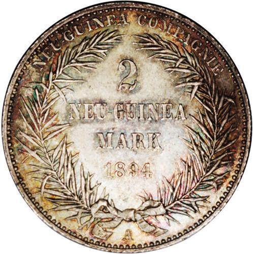 <B>German Protectorate 2 Mark 1894A,</B></I> Bird of Paradise/Date and value in wreath, KM6, attractively toned, Choice UNC.