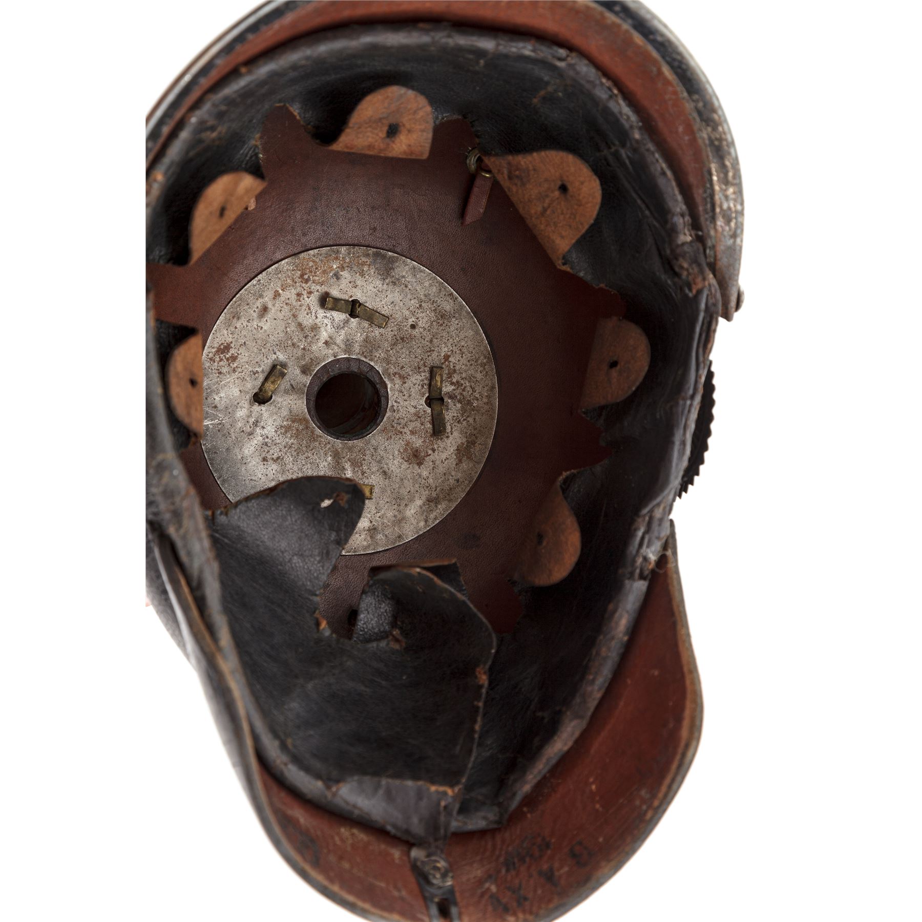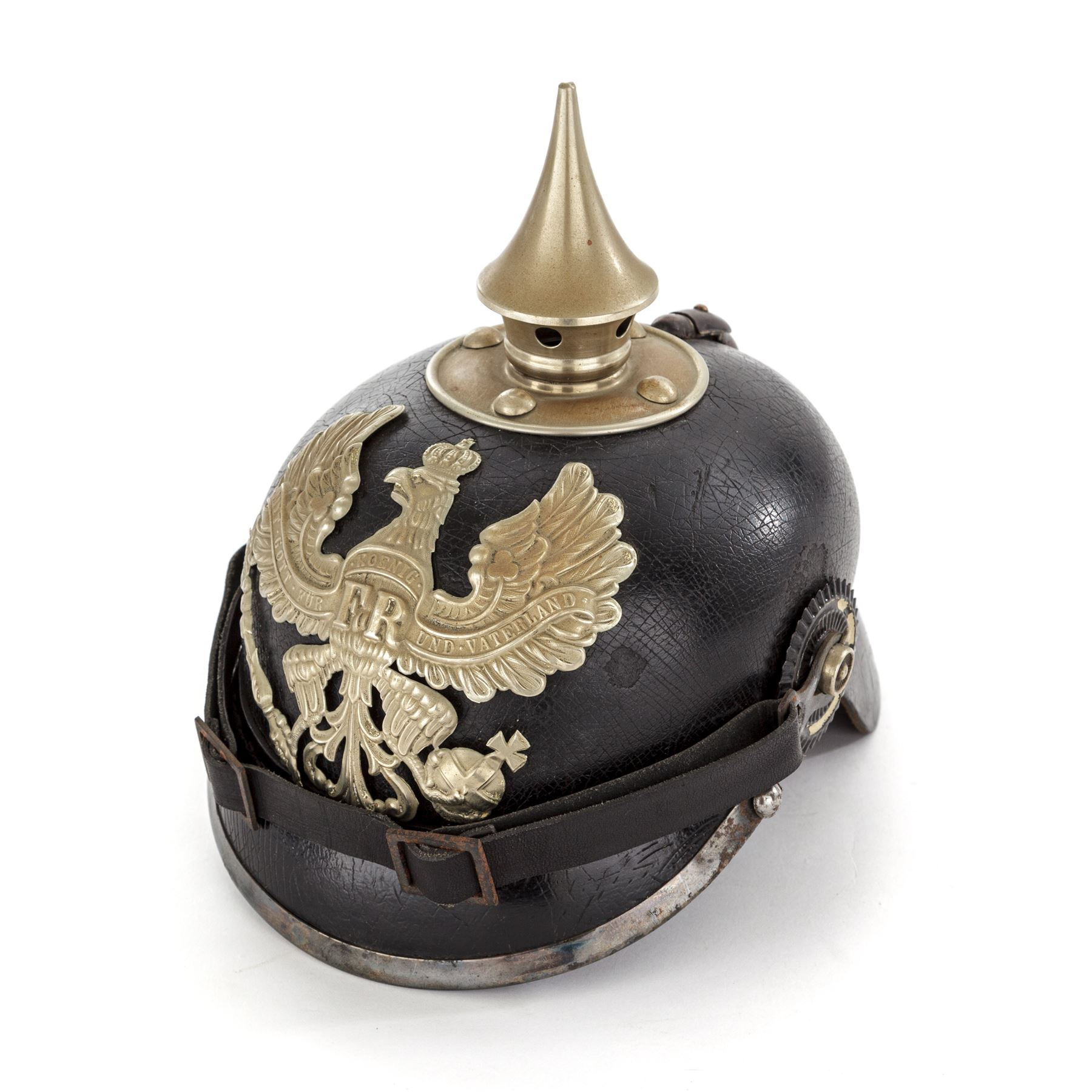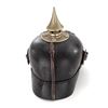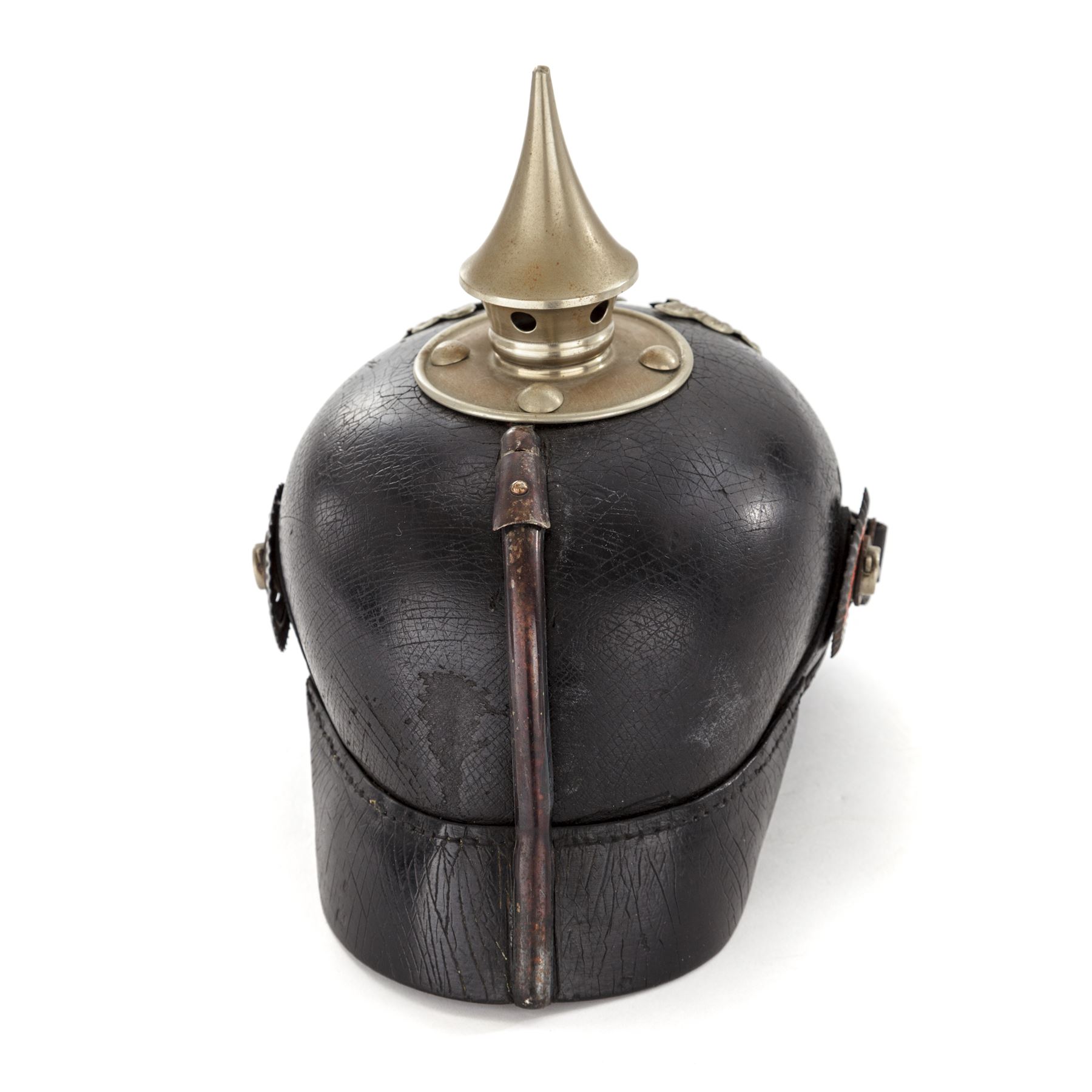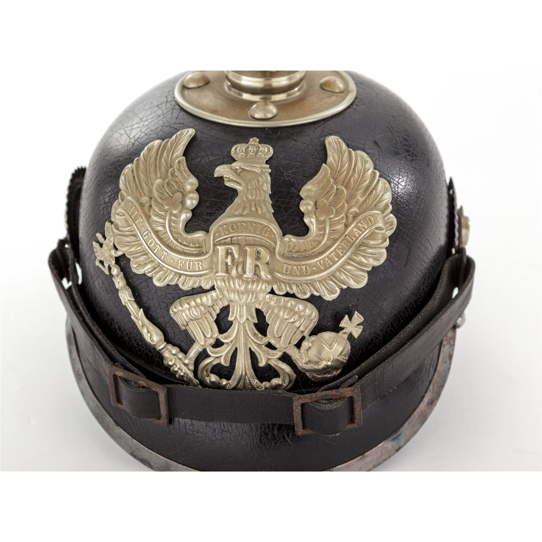 WW1 Era German/Prussian Enlisted Pioneer Pickelhaube Spiked Helmet, with silver-colored trim. Black patent leather body with front and rear visors. Metal trim on this helmet is a silver finish for Pioneer troops. Front visor edge is covered with a silver-colored band. Prussian eagle front plate is attached with metal loops and leather strips, there are no extra holes in the front body. Chinstrap is leather with metal buckles. Enlisted cockades are the tri-color German, and black and white Prussian type. Silver-colored spike base is round with round rivets for attachment. Spike is silver colored with ventilation holes around the perimeter. Silver-colored backstrap band has a sliding ventilation cover at the top. Black thin leather lining has nine fingers. There are faint regimental markings stamped into the inside of the rear visor that read ''BA. XV 1916'' and ''J.R. 18?''. This type of helmet was used from the 1890's thru WW1. Condition is good with crazing overall. Outer surface of the leather body and visors with some minor losses to the finish in the rear and sides. Lining has cracks and edgewear and is missing the leather thong tie. Silver trim shows a front visor, and backstrap fitting has a dark blue/black/silver patina. Front plate, spike base, and spike have some thinning to the bright silver finish, but do not appear to have been cleaned in some time. Leather chinstrap appears to be a newer replacement and has an aged patina to the metal buckles and attachments. Cockades have wear to the painted finish. Est.: $500-$700.