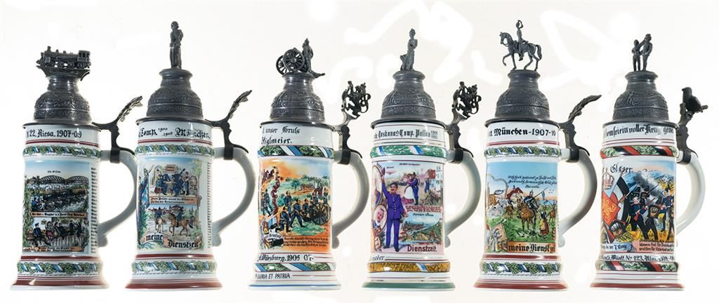 1) Railroad engineer's stein with pewter top holding a steam locomotive. The stein painted with construction scenes and gemutlichkeit happenings. Lithopane bottom of soldier giving girl a flower. 2) Cavalry stein with pewter top of solider and scenes of cavalry life with house and girls. Lithopane bottom of a bust of an officer. 3) Cannoneer's stein with cannoneers on top with a cannon and cavalry in the field of the stein. Lithopane bottom of soldier holding hand with girl. 4) General pictorial Army with pewter lid that has a figural head of lions and soldier with rifle. Ht. 12in with lithopane bottom depiction of a German General bust. 5) Cavalry stein with pewter top of a cavalry officer with sword on top. Scenes on stein of cavalry charges. Lithopane bottom of solider holding hand with girl. 6) Soldier's stein with pewter top that has 2 soldiers shaking hands. Scenes of bivovac area and hand to hand combat fighting. Lithopane bottom with soldier and girl holding hands by a campfire.