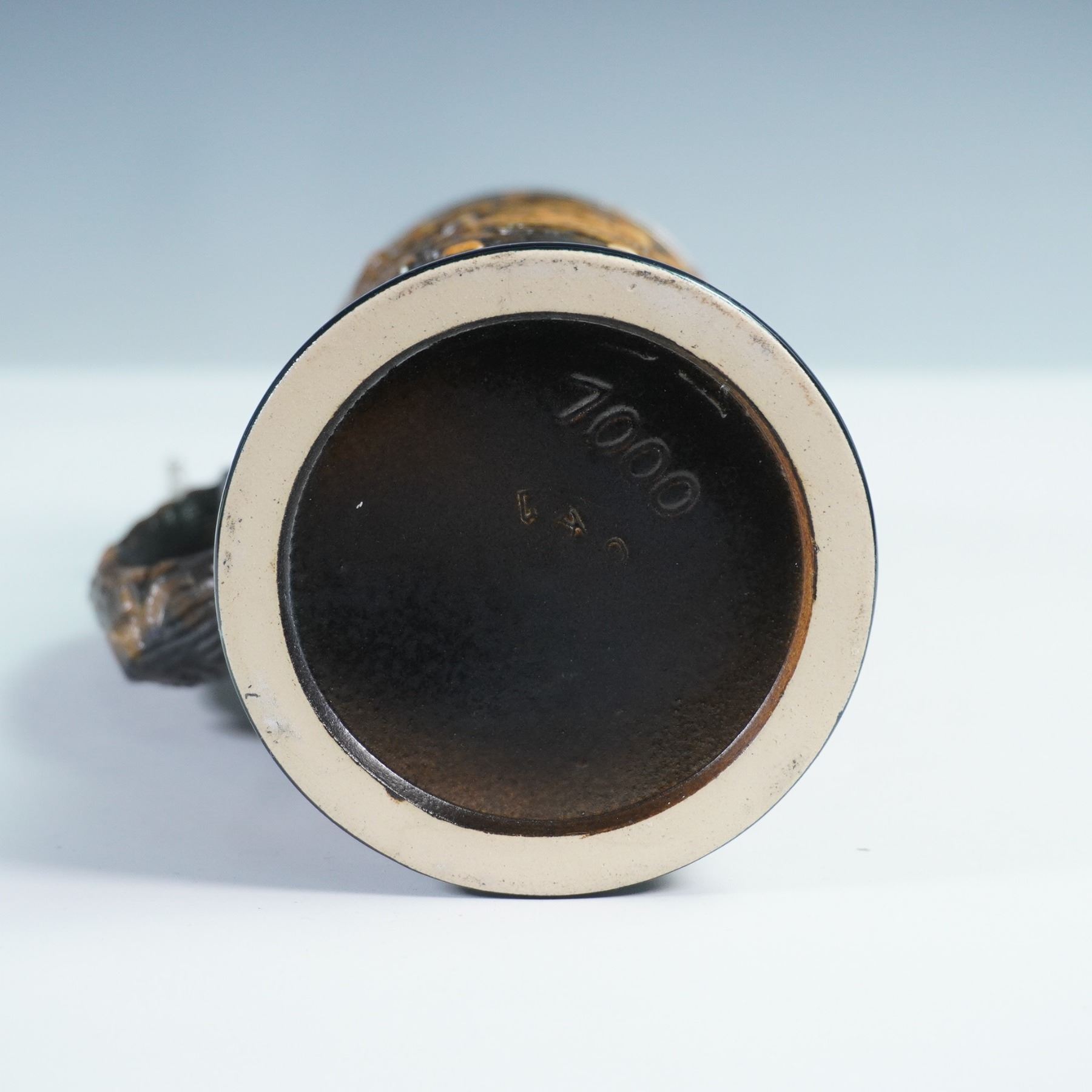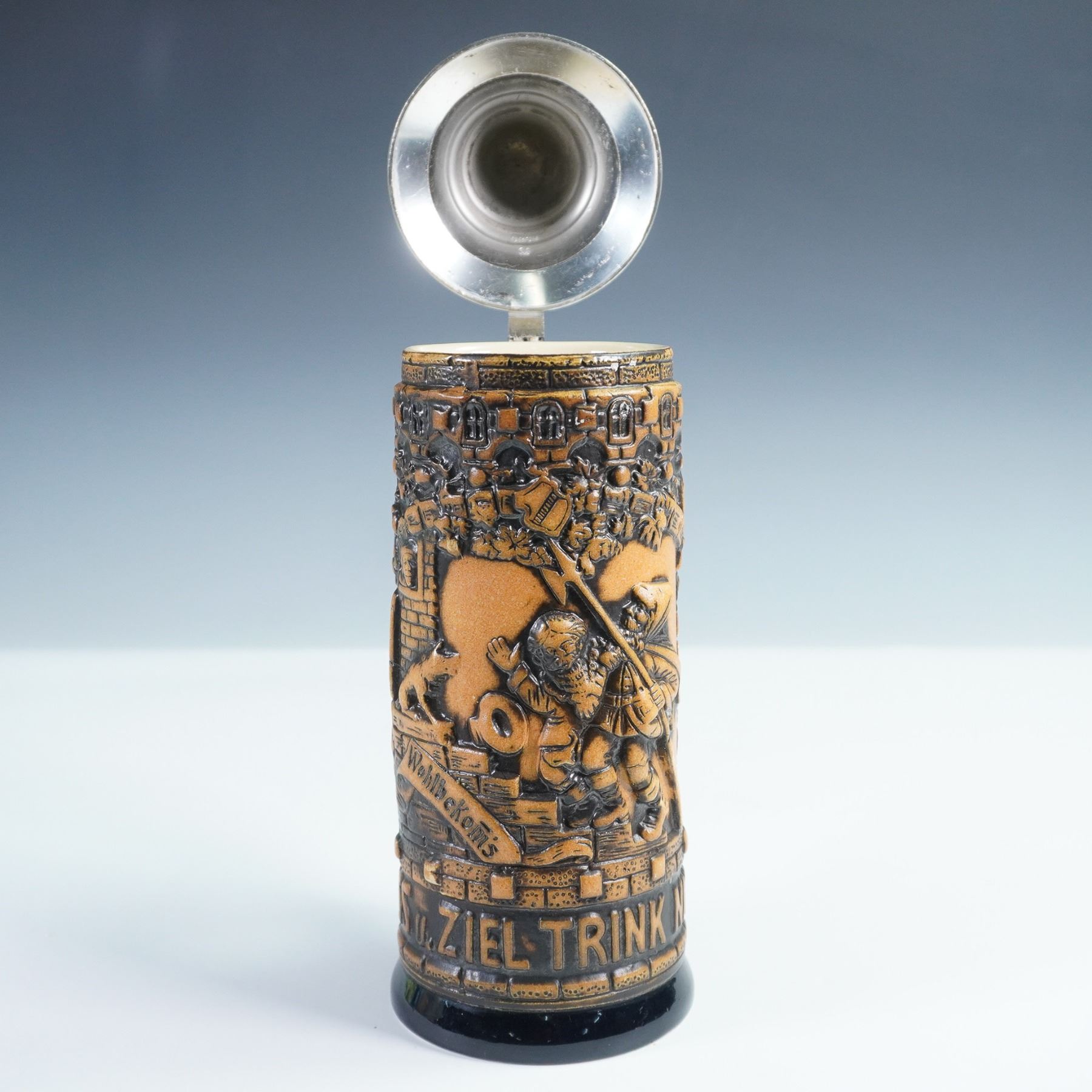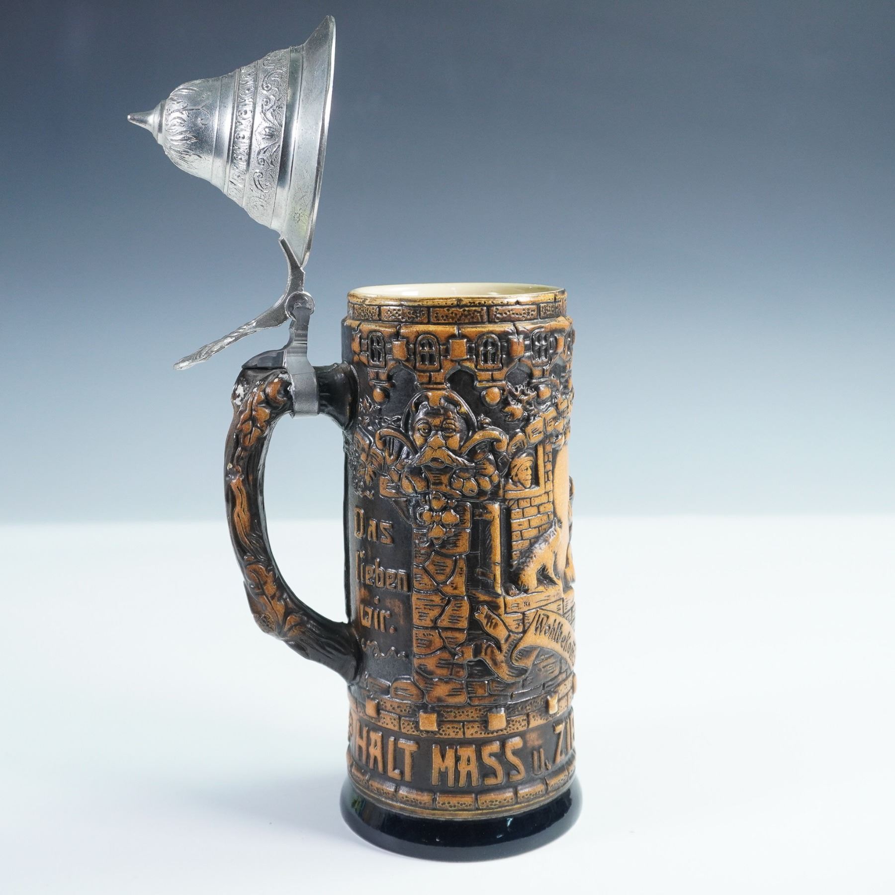 Traditional German beer stein featuring detailed high relief decoration. The body of molded stoneware in tan and dark brown glaze, with raised German inscriptions. Topped with a hinged pewter lid adorned with embossed designs and an ornate thumb lift. Interior of lid stamped DBGM. Marked 1000 to underside.