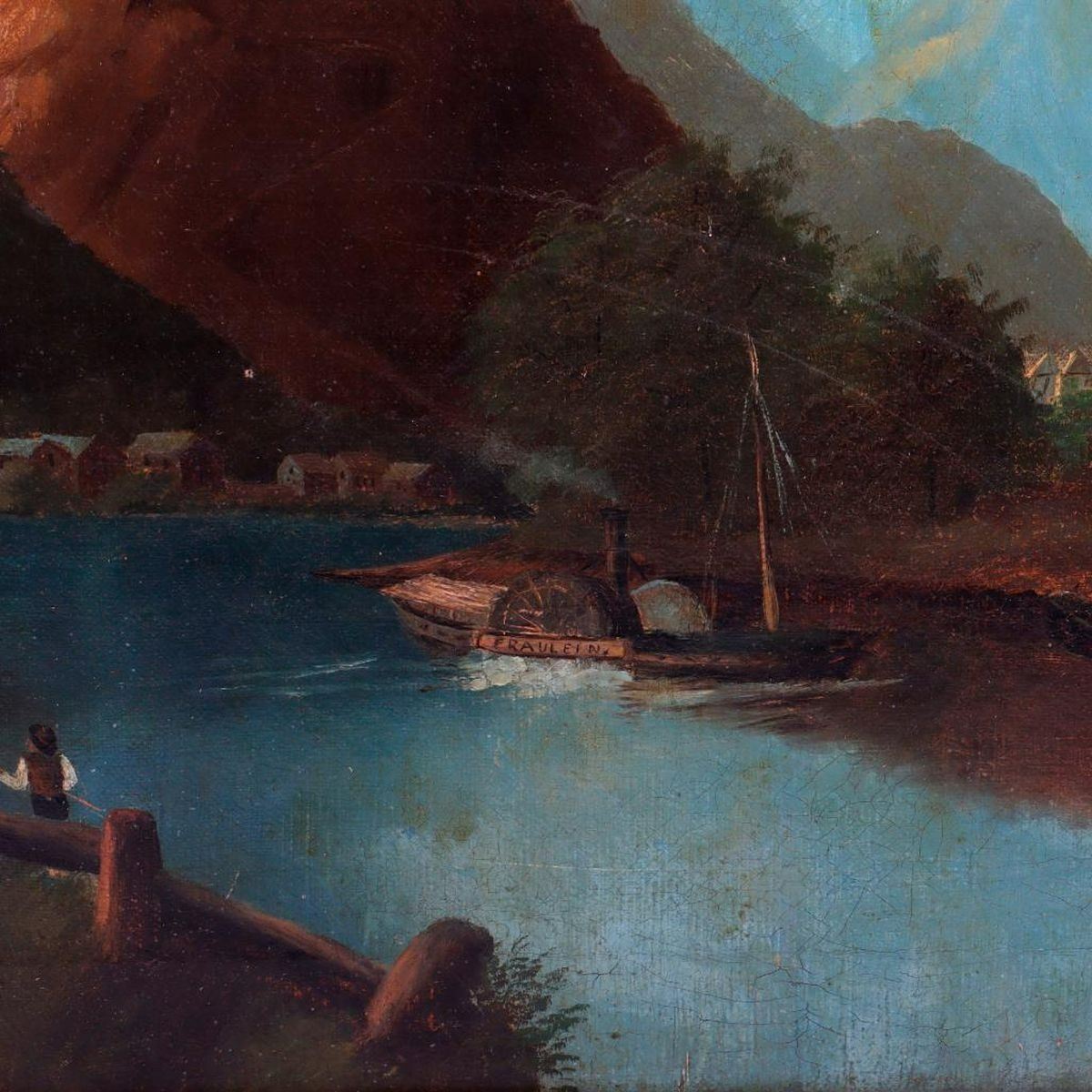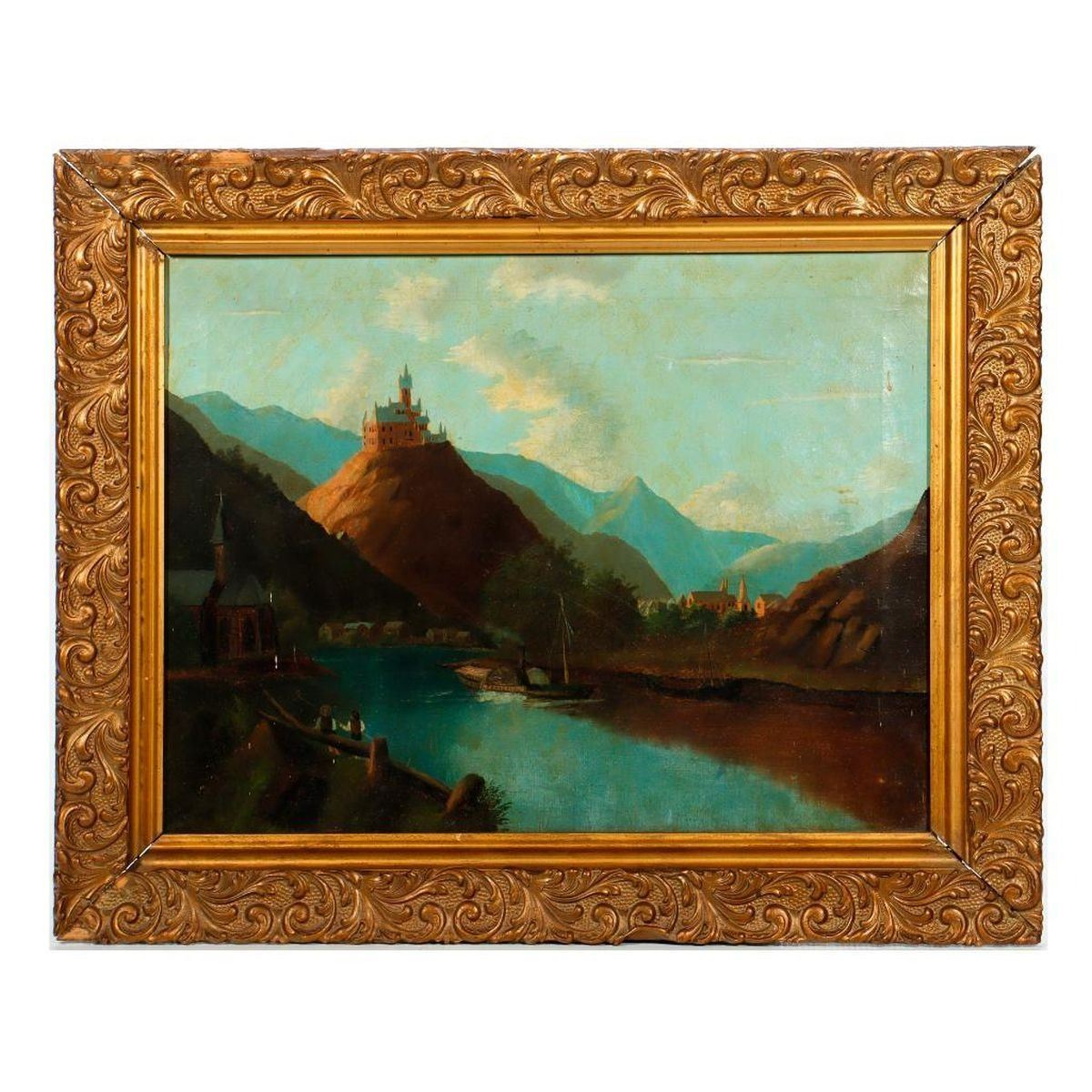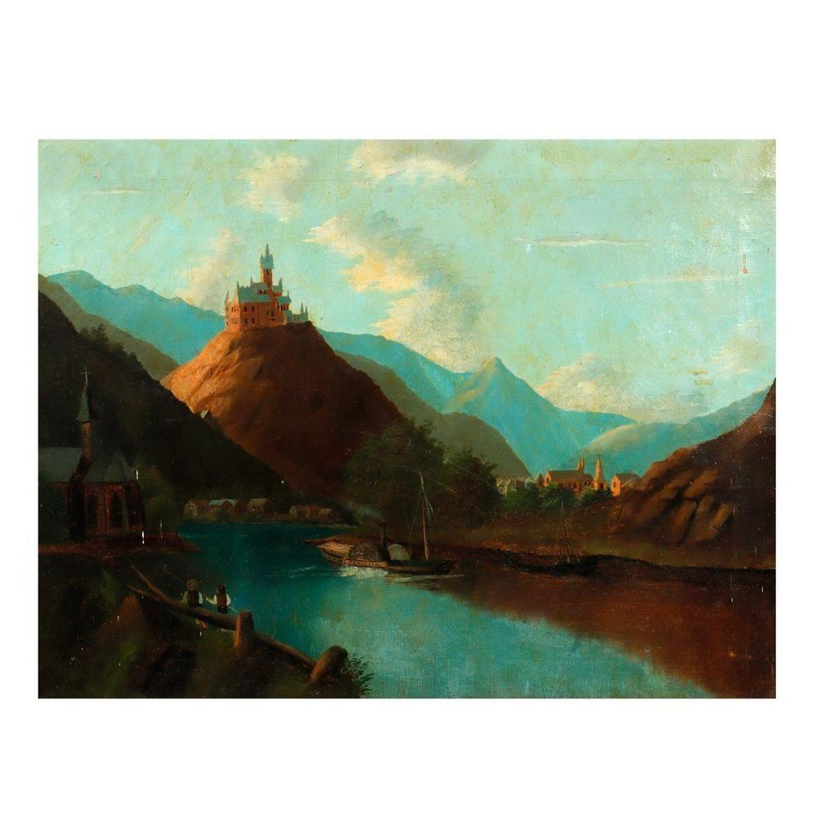 Artist: Unknown. Title/Subject: River landscape with paddle boat "Fraulein" and castle on a hill. Size: 15 1/2in x 20in. Year Created: c. 19th/early 20th century. Medium/Ground: Oil on canvas. Condition: Stretcher marks, craquelure, staining, small paint splatters. Condition Report: All lots are sold as is and where is. Turner Auctions + Appraisals, LLC provides condition reports upon request to aid in your bidding decision. No statement regarding age, condition, kind, value, or quality of a lot, whether made orally at the auction or at any other time, or in writing in this catalog or elsewhere, shall be construed to be an express or implied warranty, representation, or assumption of liability. All sales are final, Turner Auctions + Appraisals, LLC does not give refunds based on condition. Turner Auctions + Appraisals, LLC does not perform any shipping or packing services. We do have a list of suggested shippers who gladly provide quotes prior to your bidding. Please visit our webpage for a list of recommended shippers.