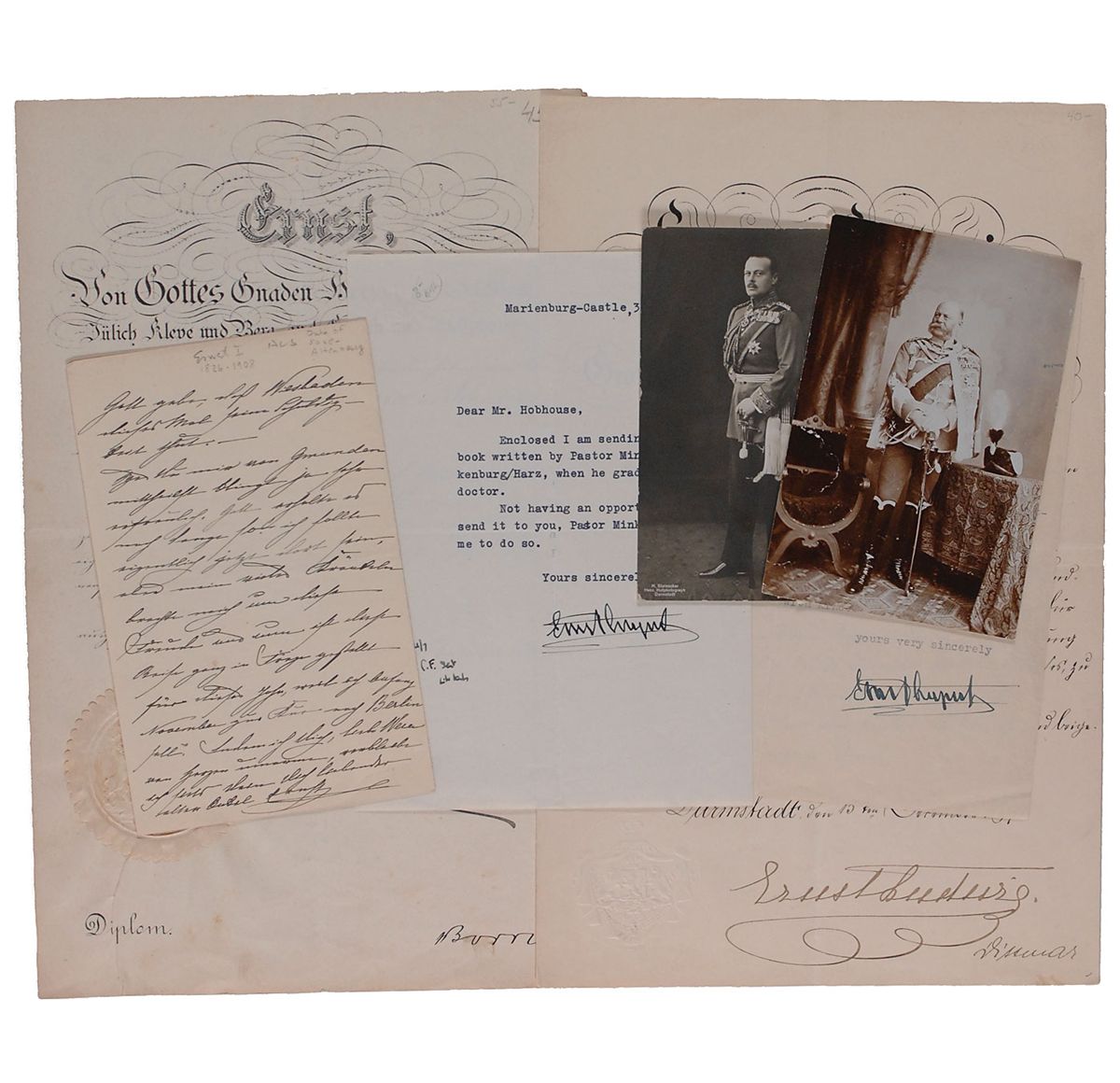 Five items consisting of letters and documents, each signed by a German Royal: two TLSs by Ernst August, Duke of Brunswick and Lunenberg, dated 1947 and 1948; an ALS by Ernst I, Duke of Saxe-Altenburg, four pages on two adjoining sheets, dated 1902; a DS by Ernst II, Duke of Saxe-Altenburg, dated 1909, awarding the Saxon Merit Medal for Art and Science; and a DS by Ernst Ludwig, Grand Duke of Hesse and Rhein, dated 1897, appointing a military officer. In overall very good to fine condition. Accompanied by two unsigned vintage postcard photos and the original transmittal letter for one document.