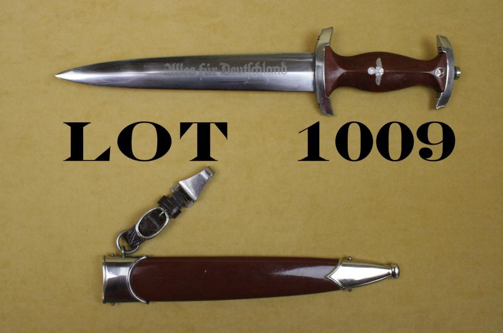 German SA dagger and sheath approx. 14-3/4” overall with an approx. 9” blade marked “Gebr. Grafrath, Solingen” with RZM and M7/30 mark at hilt on one side of blade and etched along the center of the opposite side of the blade “Ulles fur Deutschland”; the blade is overall excellent with a very good wood grip with inset spread eagle over swastika and SA emblem at top of grip below the bar pommel; excellent sheath with approx. 99% brown paint remaining and throat, tip and leather hanger. Est.: $350-$700.