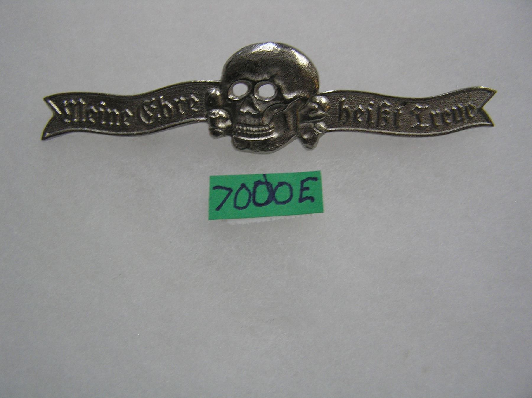 German SS dining jacket skull bar badge silver colored with pin back WWII style high quality reproduction collectors, re-enactors,historical or theatrical collectors piece est. value $80.00-$100.00