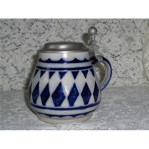 This ia a German Salt Glaze, Pewter Lidded Stein. It is a short, round Colbolt and Gray stein. There are two colbolt bands around the bottom, with the main body having a colbolt and gray diamond design, ending at the top with a scallop. The lid is Pewter. Inside the lid it looks to have an etching of an angel (hard to see) with a "R" on the left and a "Z" on the right side of the angel. Thank you for vewing.