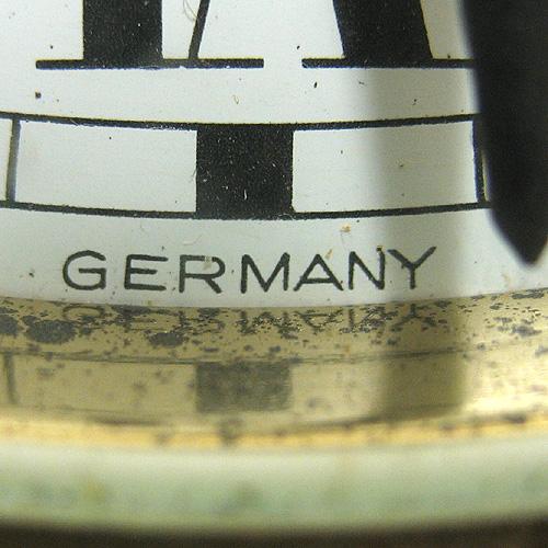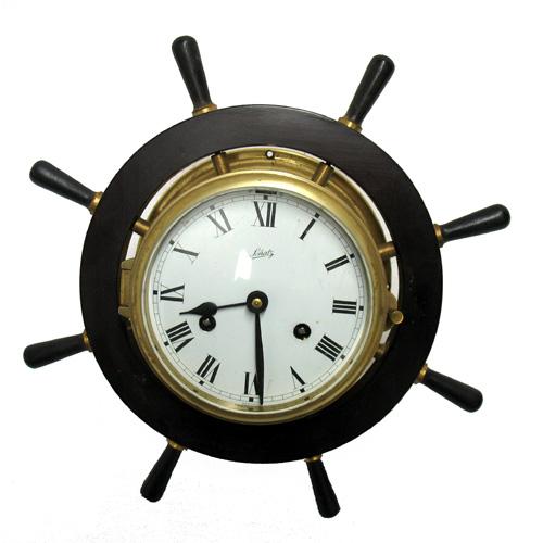 German Schatz ship's clock with striking bells, mounted in mahogany "ship's wheel" in brass case; with original instruction sheet and envelope; C.1950; 13" diameter (slight wear around dial)