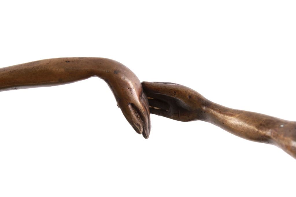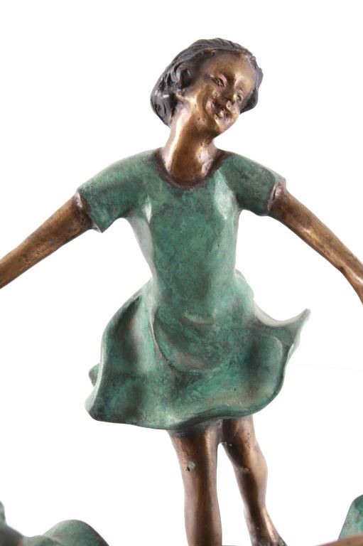 In this lot is a beautiful, playful sculpture with three cheerful dancing girls. The sculpture is heavy and has a lovely color. This sculpture likely comes from Germany. There is an "M" on the inside of one girl’s hand. This piece probably dates back to the 1950's. The dimensions are 9 1/2" wide and 9" high and it stands on a black console. The sculpture is in fair condition and has minor chips.