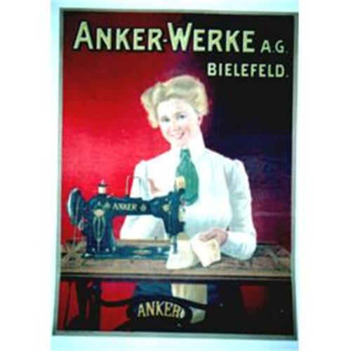 A smiling woman uses her Anker-Werke sewing machine to mend a garment. A wonderful poster for a sewing room or den, the poster is linen backed, measures 21" x 28" and is in excellent condition.