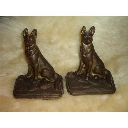 This is for a set of German Shepherd Bookends. The Dogs have their heads facing forward. I am not sure but they look like they have bronze and cast metal. Some seams are filed. While others aren't. The base has another thin sheet of bronze added. The base has file marks on it. The concave section of the back of the dogs look like they have gold color applied. The front of the bookends have a nice patina. They haven't been cleaned. They are heavy. There are no repairs.