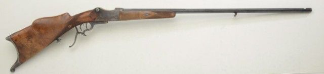 German Shutzen rifle with Martini type action, 8 x 15 x 46 cal., blue and case hardened finish, checkered wood stocks, rear and front sights removed. The barrel shows 50-70% toning original blue, the action shows 10-20% case hardening, some light erosion and normal aging. The stocks are fair to good with some scratches, dings, mars, dents, and 1 large chip of wood missing on the right side in the center of the checkering at grip. Good action, excellent bore, would improve greatly with slight restorations. Est.: $400-$800