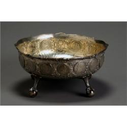 The circular bowl mounted around the exterior and interior with coins, raised on four talon and ball feet. Base with inscription dated 19ten December 1911, impressed 800 and with crown and crescent mark.