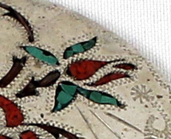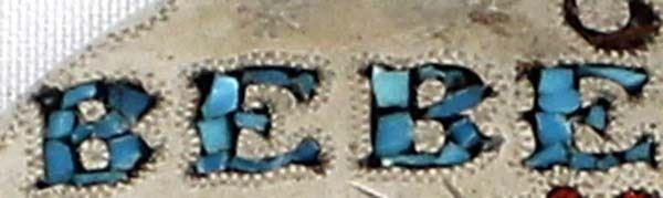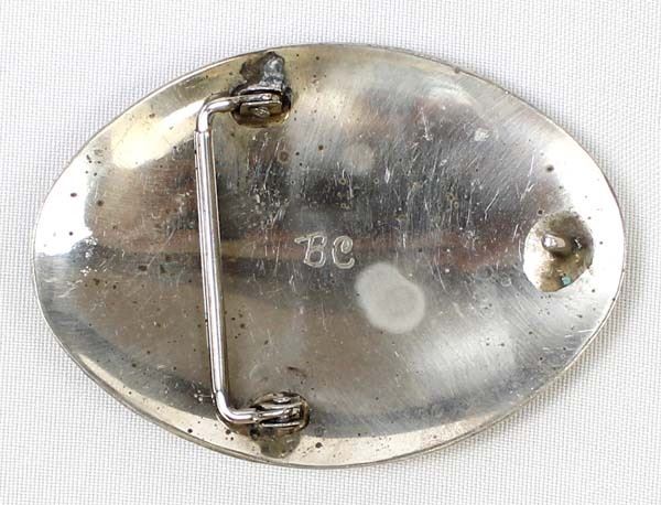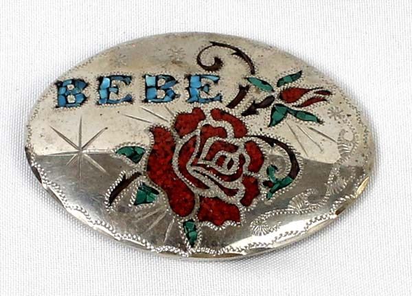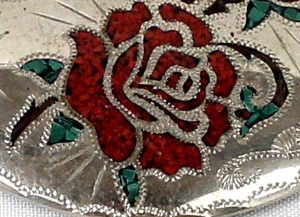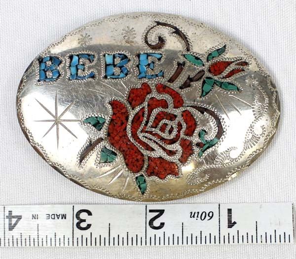 German Silver Coral & Turquoise Inlay Buckle, engraved initials on the back BC, personalized ''Bebe'', measures 2.5'' x 3.5''