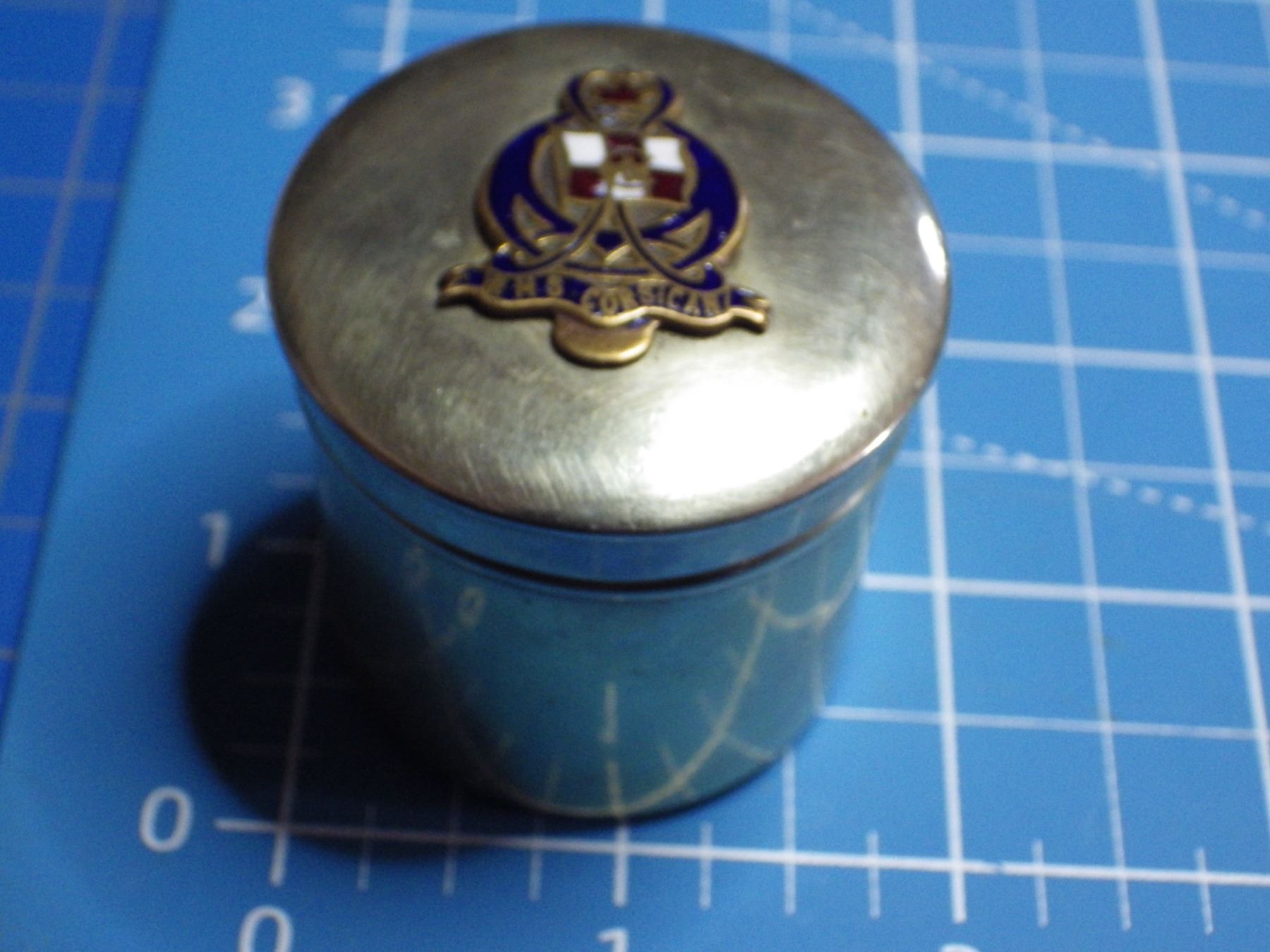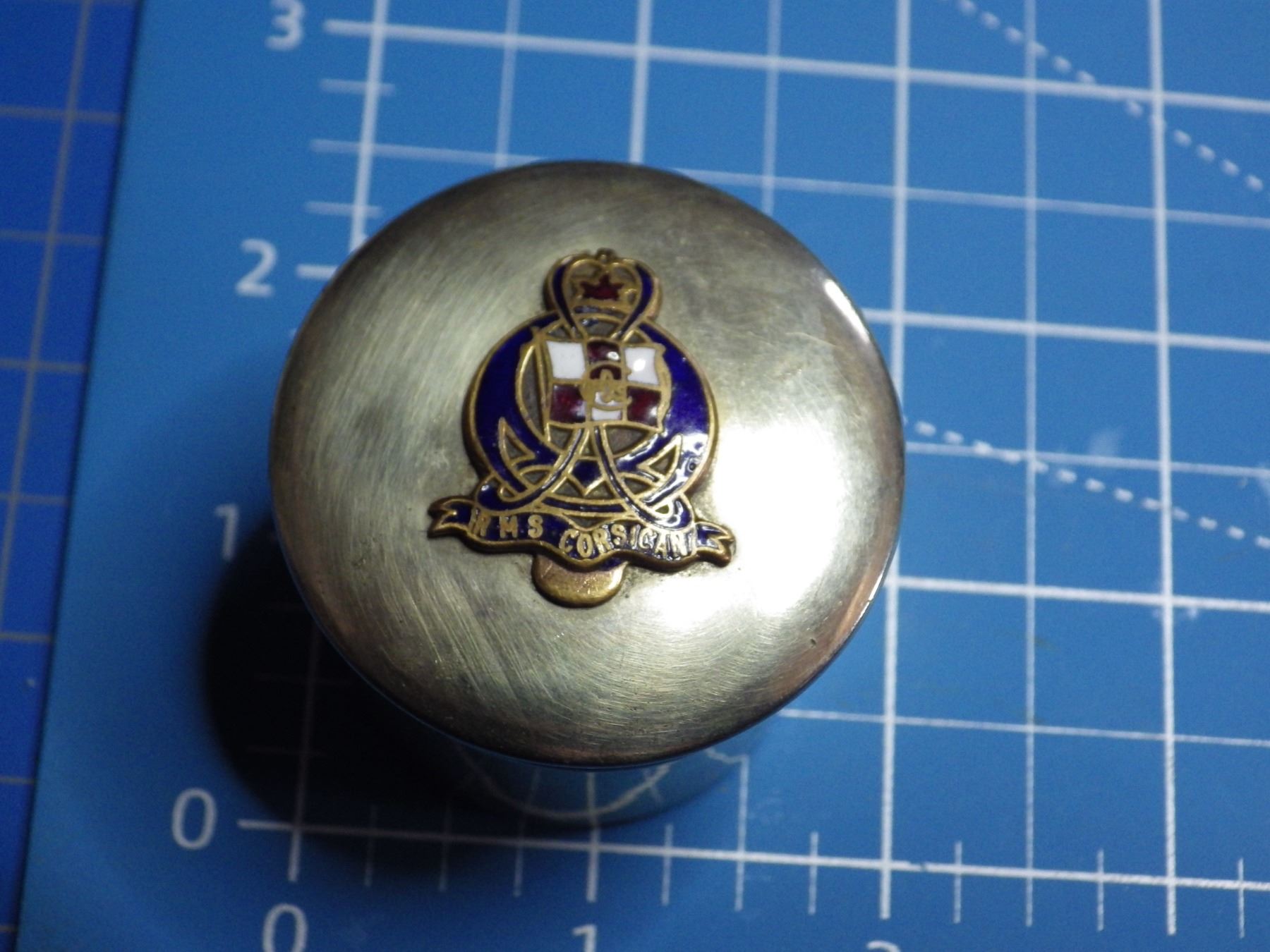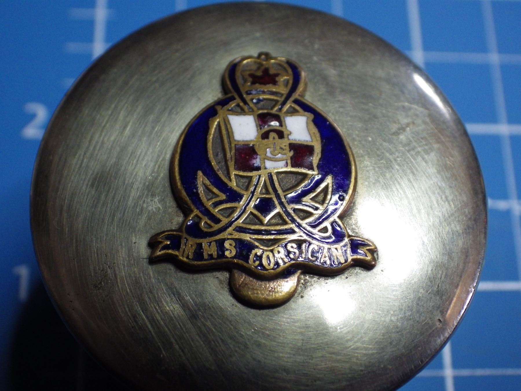 German Silver container with enamled design that reads HMS Corsian. HMS Corsican was a steamship famous for having hit the same iceburg that sank the Titanic a few days later. The Corsican survived its collision. -- CONSIGN # A18