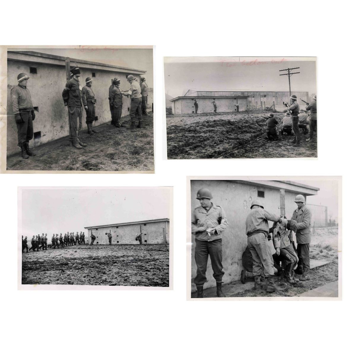 Series of World War II press photographs depicting the execution of German spies by firing squad. Four images dated May 1945. Caption: ''Captured in American uniforms, three German spies face execution by a firing squad after they were court martialed. At time of capture they carried with them a radio transmitter and receiver to relay...results of their reconnaissance of roads & bridges...they had perfected their disguise by mingling with American prisoners of war...'' Measurements range from 6.25'' x 9'' to 8'' x 9.5''. Excellent.