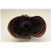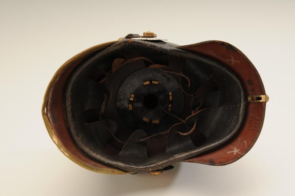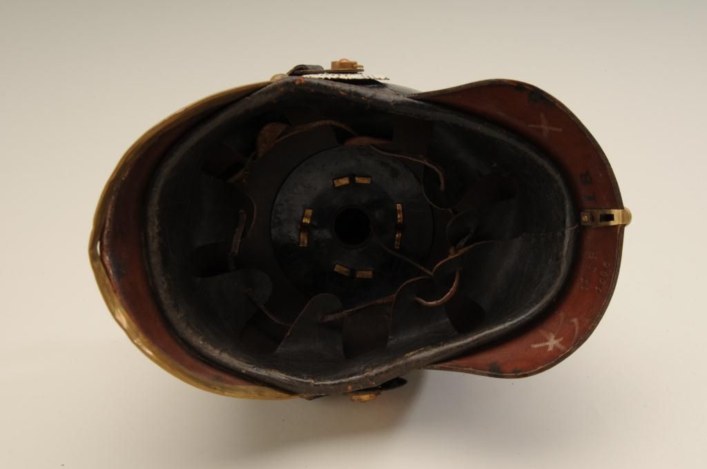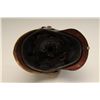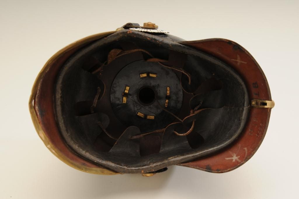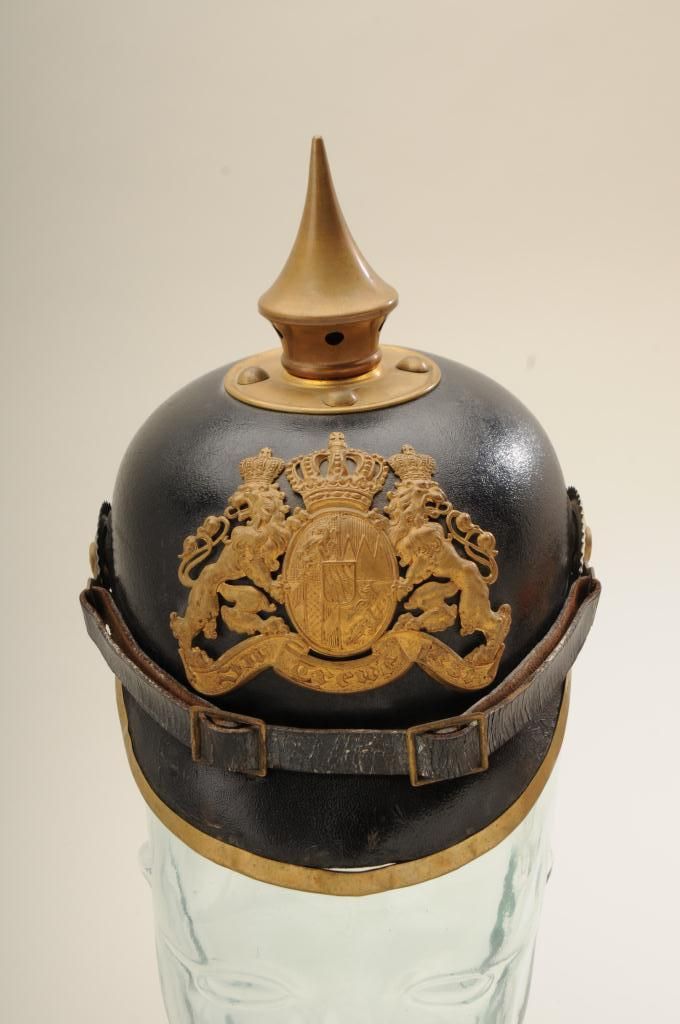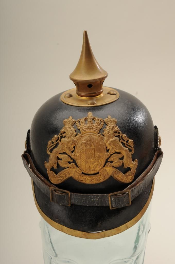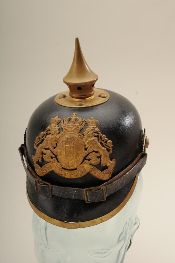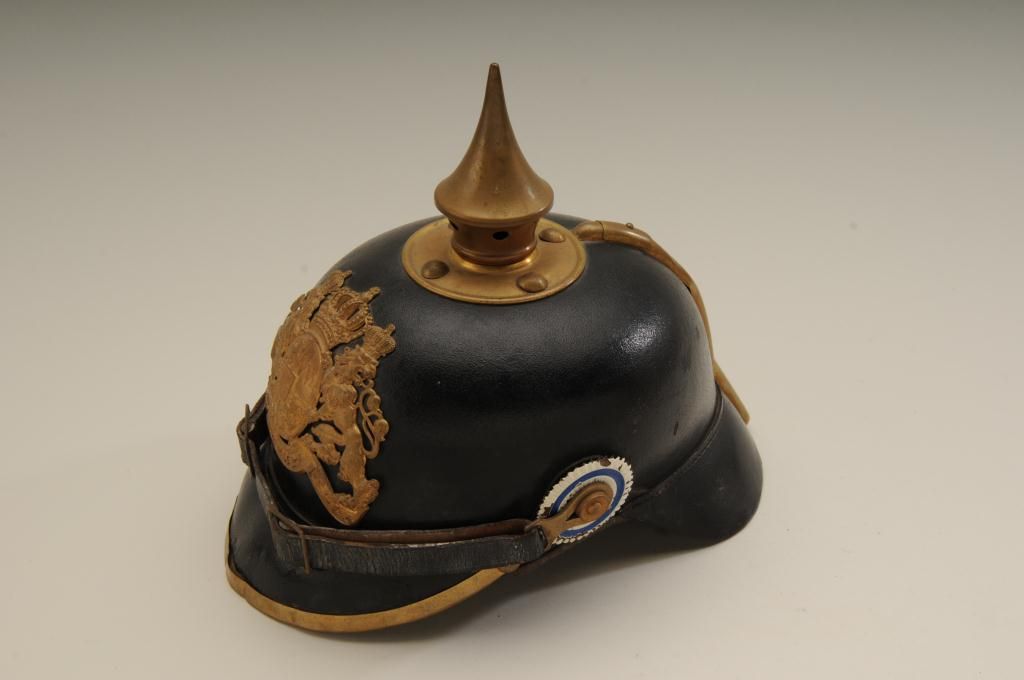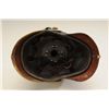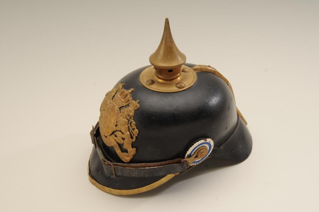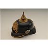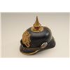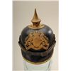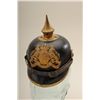 German Spike helmet from Imperial era in good untouched condition showing some slight cracking, normal aging and minor warping to the body but generally good overall. The front plate shows two Lions and the Germaninscription of In Treue Fest. Along with crown and what appears to be a Saxon crest at center. The brim shows some dents in the brass and slight folding. The chinstrap is retained and shows black and white pips onone side and blue and white on reverse. The original liner is retained and in good condition. The interior of the helmet is marked 11 JR and dated 1906. From on of San Diego’s oldest collections. Est.: $150-$300.