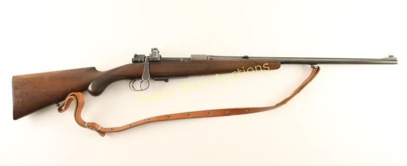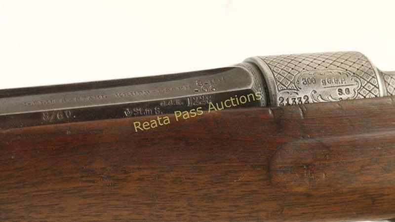 Finely sporterized German bolt-action Mauser rifle chambered in 8mm-06. Features a blued finish, simple diamond pattern engraving, matte ribbed 23" half octagon barrel, ramped blade front sight, dovetailed folding leaf rear sight, Lyman 57SME receiver sight, double set triggers, internal box magazine with removable floorplate, flat 'spoon' style bolt handle, manual safety, smooth brown leather sling and one-piece contoured walnut pistol grip shoulder stock with a right handed cheek rest, finely checkered grip with round knob & serrated black hard rubber buttplate. The barrel is marked "J.J. REEE, HOFBUCHSENMACHER", "FLUSS-STAHL", "KRUPP-ESSEN" & "BONN". Rifle exhibits approximately 40% of it's blued finish showing nice honest wear with a majority of the barrel thinning to patina and the receiver ring, floorplate & triggerguard in-the-white. Action is smooth with a crisp trigger pull, bore is very good and wood stock is good+ as worn with several small blemishes. Condition is good to very good. ***C&R Firearm*** ***Modern Firearm***