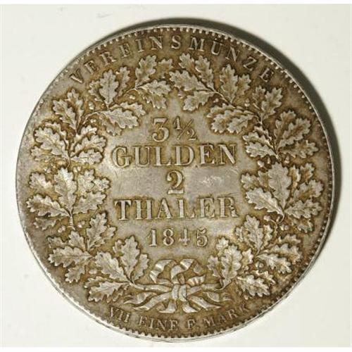 <B>A 3-piece lot of miscellaneous German States including:</B></I> Frankfurt 2 Taler 1845, KM329, about XF; Saxony 2/3 Taler 1696 I, KM655, XF details with obverse flan flaws and a mount mark on the edge; and a Saxony 2 Taler 1854, KM1149, VF-XF.<BR><BR><b>Shipping:</b> Coins & Currency (<a target="_blank" href="http://www.heritageauctions.com/common/shipping.php">view shipping information</a>)
