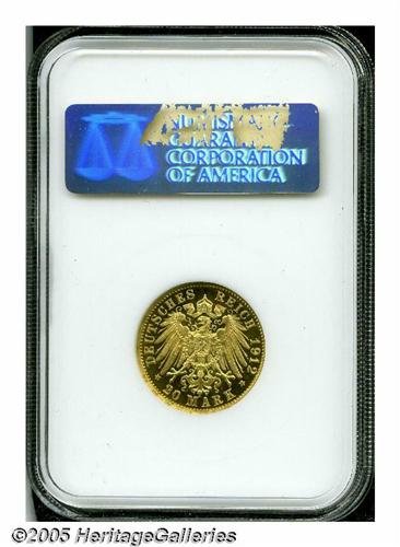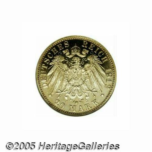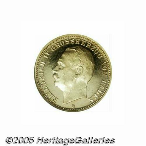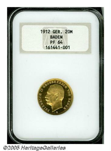 <B>Baden. Friedrich II Gold 20 Mark 1912G,</B></I> Fr-3760, KM284, Proof 64 NGC. Full cameo appearance with light marks in the obverse field.