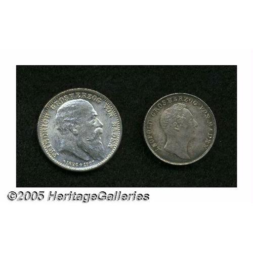<B>Baden. High grade pair as follows:</B></I> 1/2 Gulden 1838, KM209, toned UNC; and a 2 Mark 1907, Death of Friedrich, lustrous UNC with light abrasions.