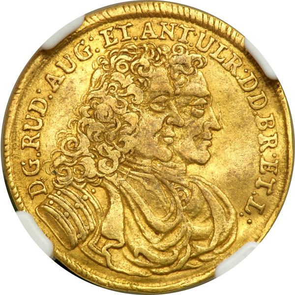 German States - Brunswick-Wolfenbüttel. Ducat, 1699-HCH. Fr-644; KM-595. Rudolf August and Anton Ulric, 1685-1704. Conjoined bust right. Reverse: Crowned arms. Damaged. Scarce. NGC graded Very Fine, Details.