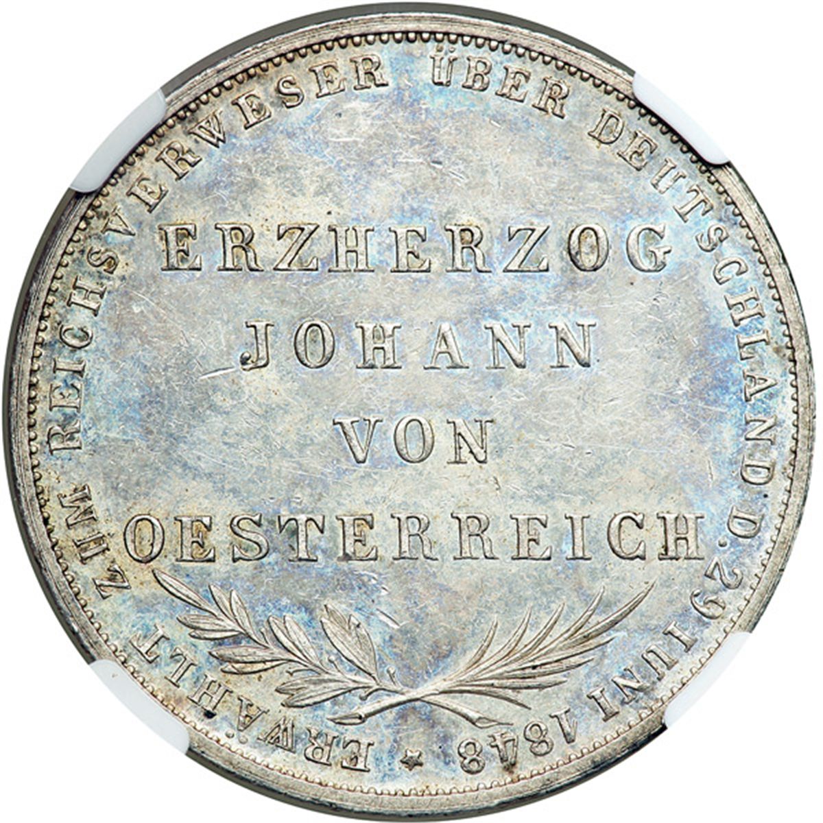 German States - Frankfurt am Main. 2 Gulden, 1848. Dav-644; Thun-135; KM-338 (incorrect on holder). Archduke Johann of Austria Elected as Vicar. NGC graded MS-62.