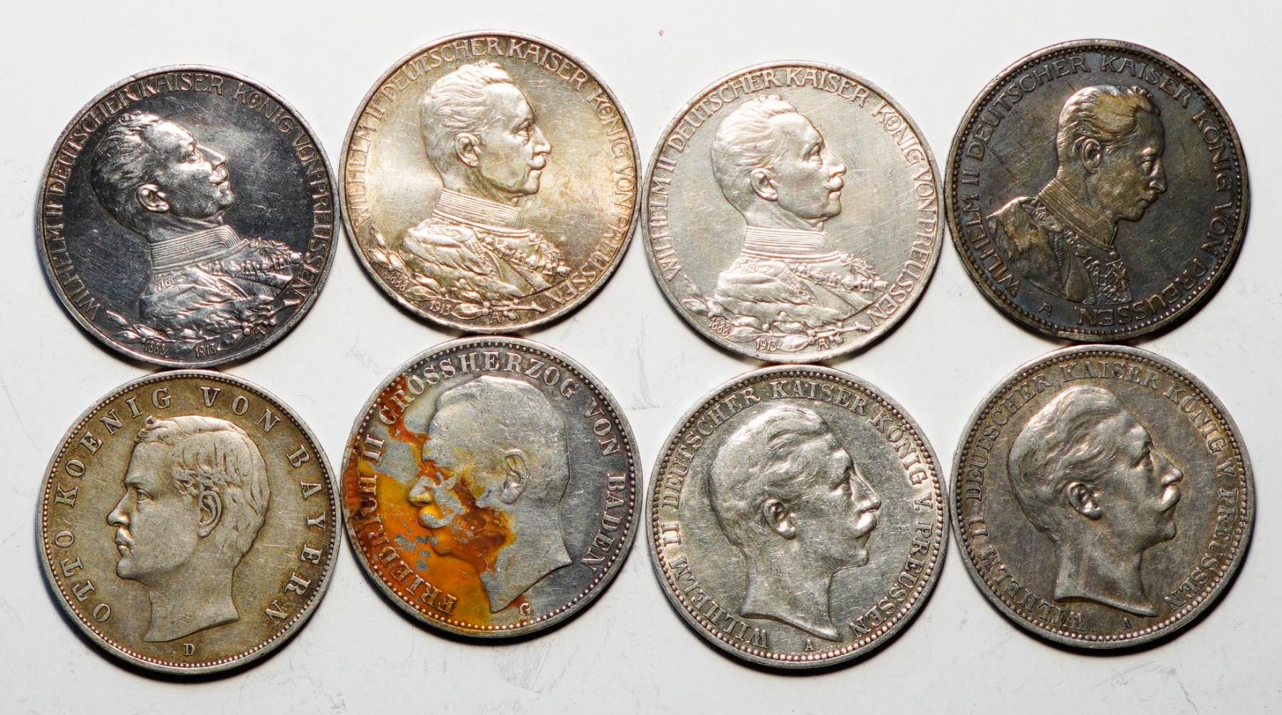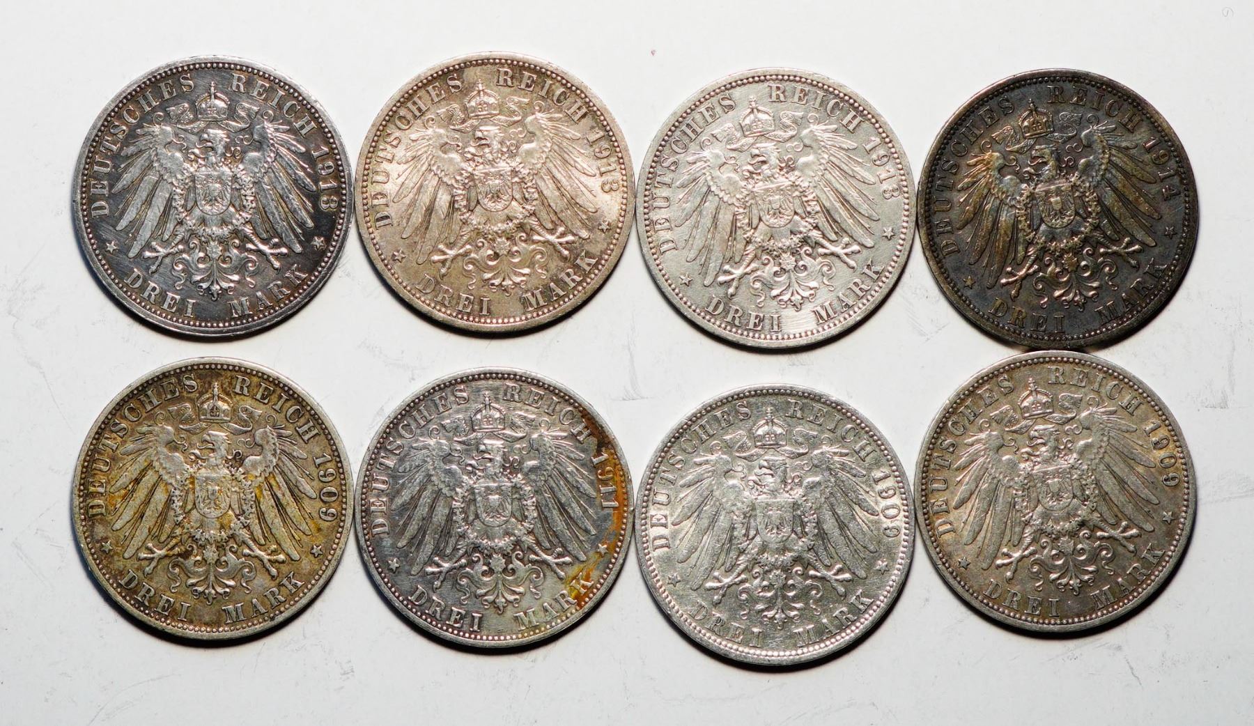 German States; Group of silver 3 Marks, Fine to AU. Lot of 8 pieces.