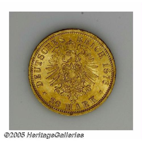 <B>Hamburg. Gold 20 Mark 1876J,</B></I> KM289, BU with an NGC insert where the coin was removed from an MS63 holder.