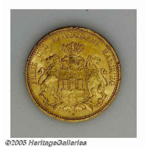 German States. Hamburg. Gold 20 Mark 1876J, KM289, BU with an NGC Hamburg. Gold 20 Mark 1876J,