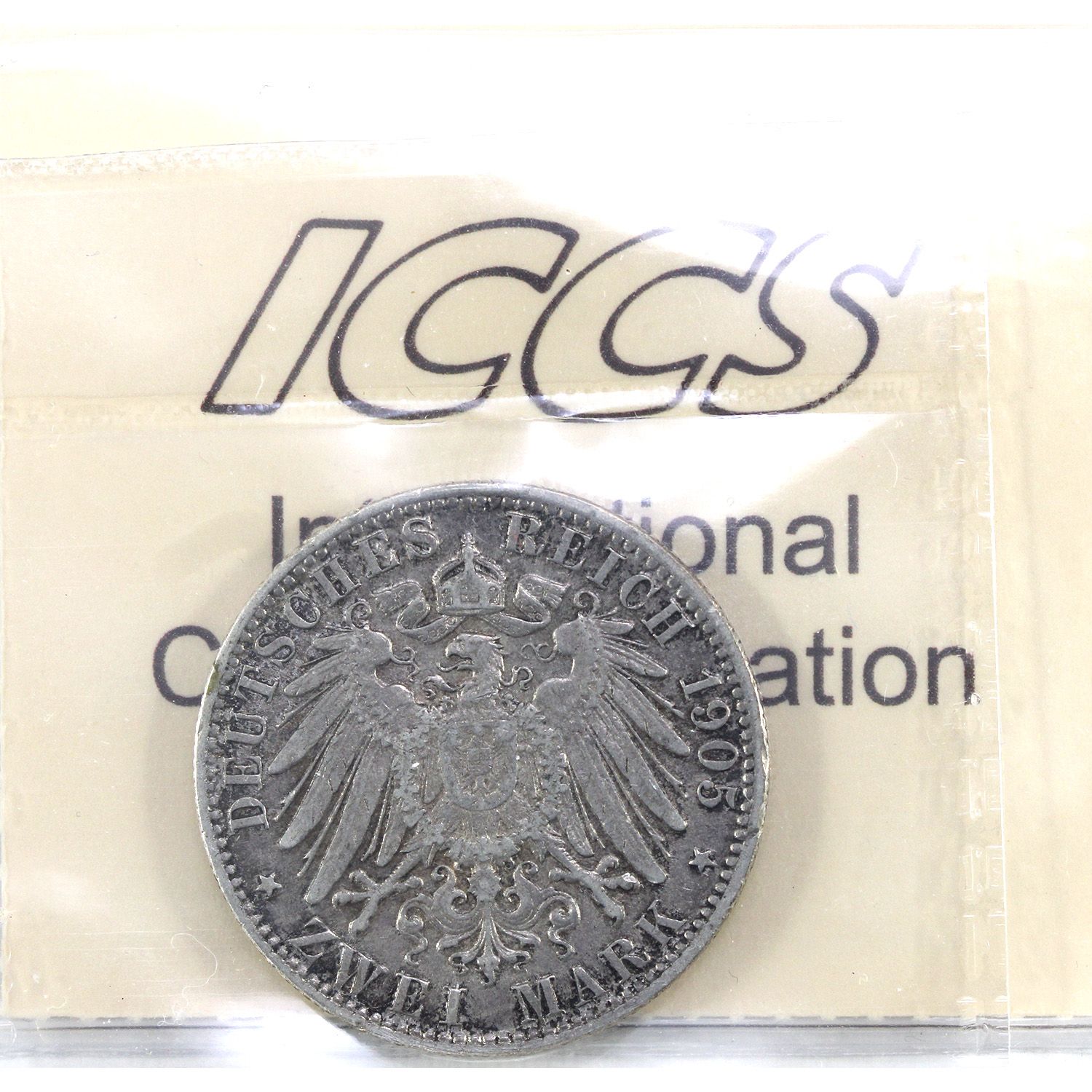 German States-Hamburg Silver 1905J 2 Mark ICCS EF40. Coin is .900 Fine and Contains 0.3215oz Pure