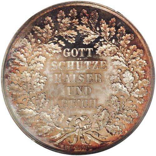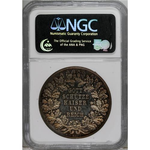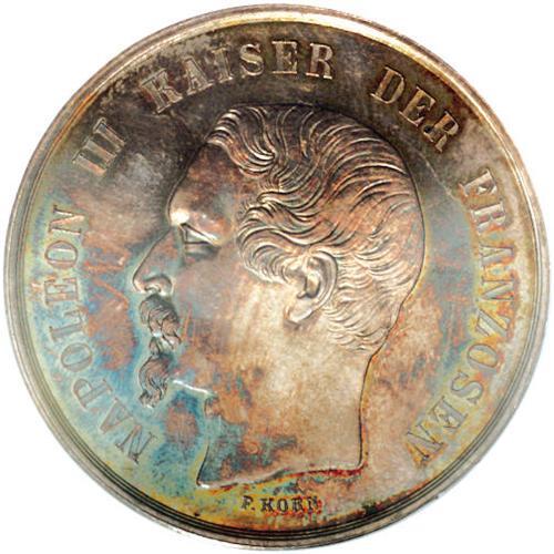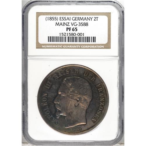 <B>Mainz. Napoleon III of France Essai 2 Taler ND (1861), </B></I>VG-3588, Proof 65 NGC, a magnificent coin with blue, green and russet patina blanketing flashy proof surfaces. Very rare silver pattern type, Obverse: Bust of Napoleon III; Reverse: German legend within a wreath "God Protect the Kaiser and Reich." (The date on the holder is 1855, but VG gives the date as 1861.)<BR><BR><b>Shipping:</b> Coins & Currency (<a target="_blank" href="http://www.heritageauctions.com/common/shipping.php">view shipping information</a>)