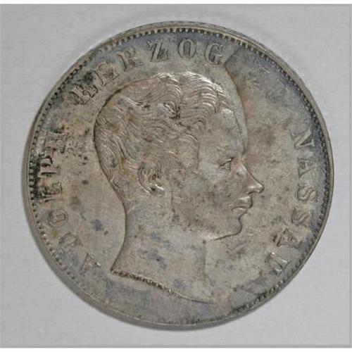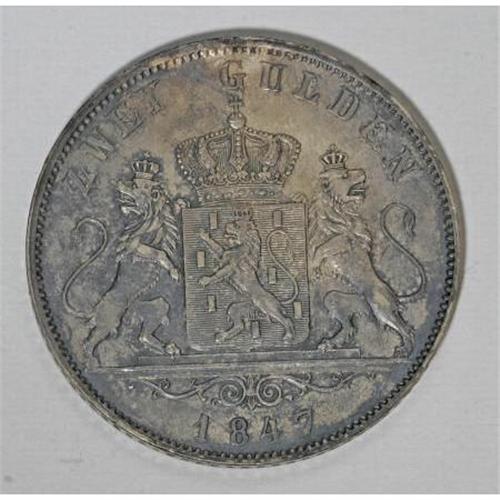 <B>Nassau. Adolph 2 Gulden 1847,</B></I> KM-C65, XF, cleaned long ago and now nicely toned. Scarce.<B> </B></I><BR><BR><b>Shipping:</b> Coins & Currency (<a target="_blank" href="http://www.heritageauctions.com/common/shipping.php">view shipping information</a>)