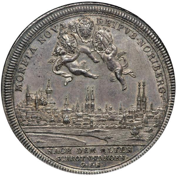 German States -- Nuremberg. 2 Reichstalers, ND (1706). Dav-2473; Kel-227. 58.38 grams. Emperor Joseph I, 1705-1711. Mintmaster George Friedrich; dies by George Hautsch. Aerial view of city, with three winged cherubs supporting three garnished shields of arms. Reverse: Laureate, draped and cuirassed bust of Joseph I right. A coin of dramatic eye appeal, the strike sharply detailed, with lustrous devices on prooflike fields, all offset by broad denticles serving to "enfold" the images. Lovely gray toning, iridescent in hues of pink and russet. Very rare, and unusually choice. NGC graded MS-63. .