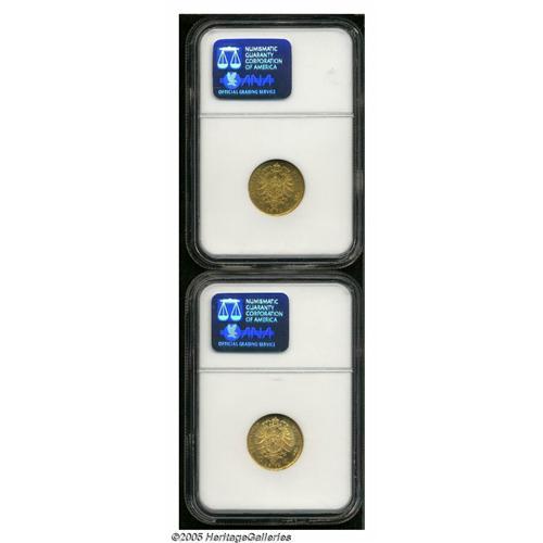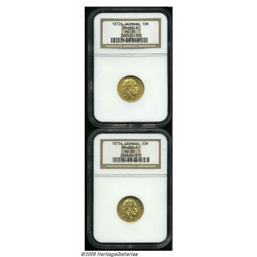 <B>Prussia. Gold 10 Mark pair as follows:</B></I> 1872A, KM502, MS65 NGC; and an 1873A, KM502, MS65 NGC.