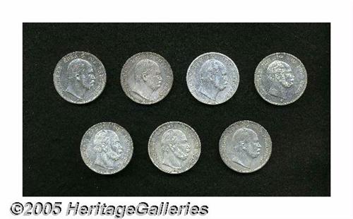 <B>Prussia. Wilhelm I Talers as follows:</B></I> 1862-A, KM489, lustrous XF; 1867-A, KM494, cleaned VF; 1870-A, KM494, lightly cleaned VF-XF with minor rim bumps; 1871-A, KM494, lightly cleaned VF-XF with minor rim bumps; 1871-A, KM494, lustrous XF; and (2) 1871-A, Victory over France, KM500, VF-XF and XF, both lightly cleaned. <B>A sold as is, no return lot.</B></I> From the Dr. Kurt Peters Collection.