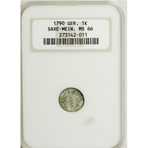 <B>Saxe-Meiningen. 1 Kreuzer 1790,</B></I> KM-88, MS66 NGC, fresh and bright, gorgeous.<BR><BR><b>Shipping:</b> Coins & Currency (<a target="_blank" href="http://www.heritageauctions.com/common/shipping.php">view shipping information</a>)