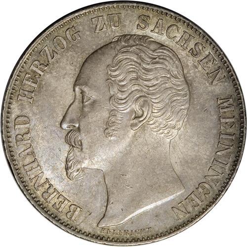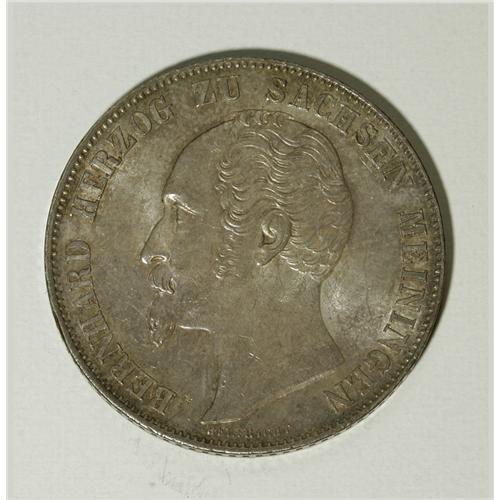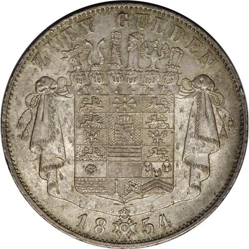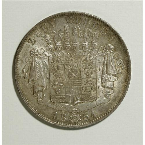 <B>Saxe-Meiningen. Bernhard II 2 Gulden 1854, </B></I>KM166, toned AU-UNC, few tiny marks on the obverse, a nice original coin with sharp details.<BR><BR><b>Shipping:</b> Coins & Currency (<a target="_blank" href="http://www.heritageauctions.com/common/shipping.php">view shipping information</a>)