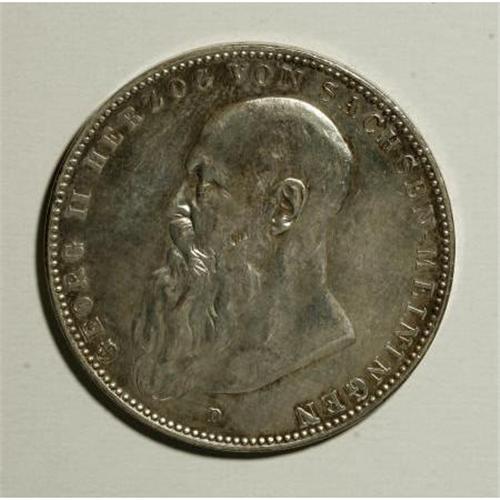 <B>Saxe-Meiningen. Georg II 5 Mark 1908D,</B></I> KM201, XF details. Lightly toned with surfaces slightly polished long ago.<B> </B></I><BR><BR><b>Shipping:</b> Coins & Currency (<a target="_blank" href="http://www.heritageauctions.com/common/shipping.php">view shipping information</a>)