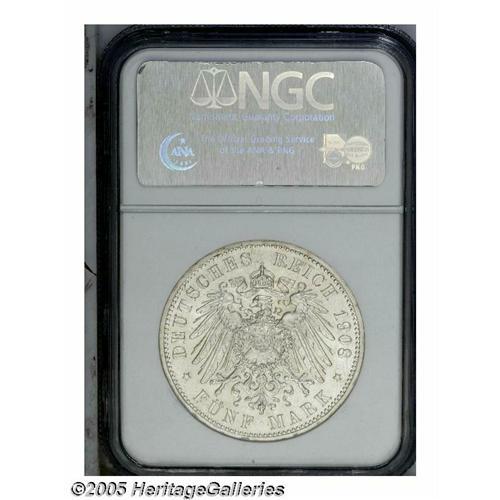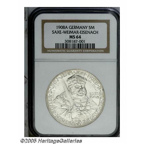 <B>Saxe-Weimar-Eisenach. Wilhelm Ernst 5 Mark 1908A,</B></I> 350th Anniversary of Jena University, KM-Y175, MS64 NGC. Blazing white with only a few tiny imperfections.