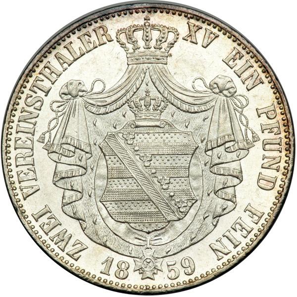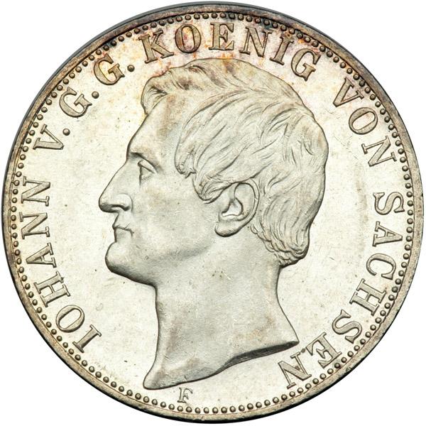 German States - Saxony. 2 Talers, 1859-F. Dav-889; KM-1195; Thun-338. Johann, 1854-1873. Lustrous. Choice Extremely Fine.