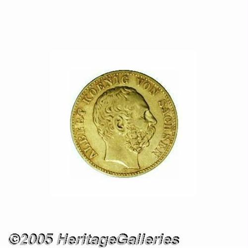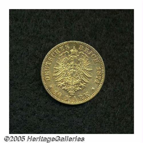 <B>Saxony. Albert Gold 10 Mark 1874-E,</B></I> Bust right/Eagle, Fr-3843, KM1235, VF with traces of luster remaining, and a very scarce issue. From the Dr. Kurt Peters Collection.
