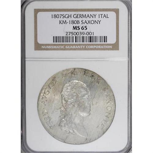 <B>Saxony. Friedrich August I Taler 1807 SGH,</B></I> KM1059.1, D-854, MS65 NGC. Fully brilliant luster with light golden toning and minor obverse flan flaws. <BR><BR><b>Shipping:</b> Coins & Currency (<a target="_blank" href="http://www.heritageauctions.com/common/shipping.php">view shipping information</a>)