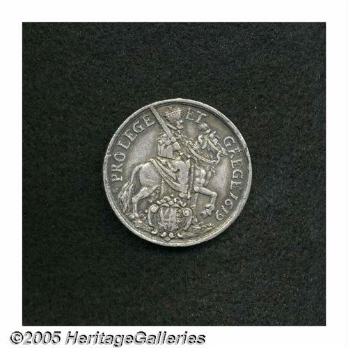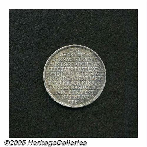 <B>Saxony. Johann Georg II Vicariat 1/2 Taler 1619,</B></I> Elector on horseback right/Twelve line inscription, Kohl-204/205, variety with date in the legend, KM118 variety, VF with flan flaws. From the Dr. Kurt Peters Collection.