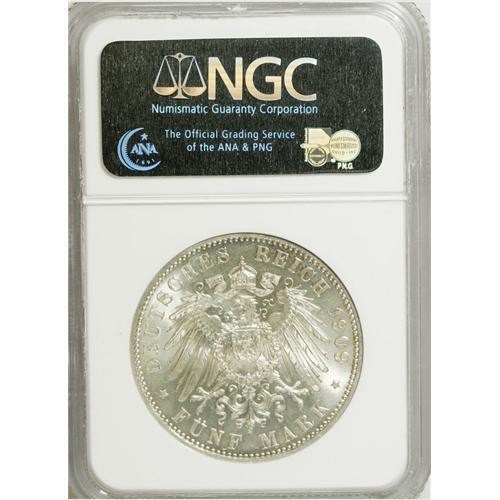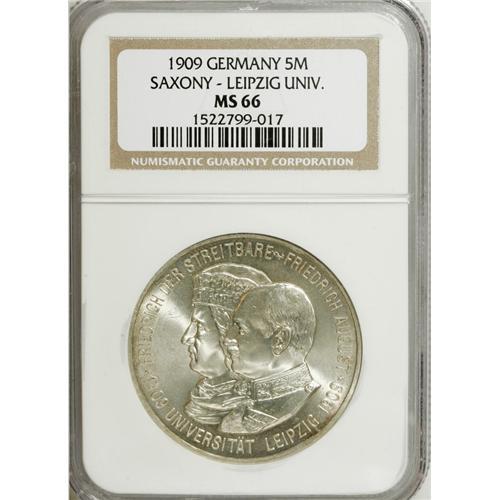 <B>Saxony. Friedrich August III 5 Mark 1909, </B></I>KM1269, MS66 NGC, a true Gem example, Leipzig University commemorative.<BR><BR><b>Shipping:</b> Coins & Currency (<a target="_blank" href="http://www.heritageauctions.com/common/shipping.php">view shipping information</a>)