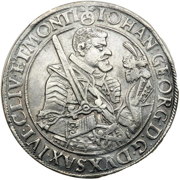 German States - Saxony. Taler, 1637. Dav-7601. Johann Georg, 1616-1656. Bust right with sword. Reverse: Helmeted arms. Cleaned and re-toned. Very Fine.