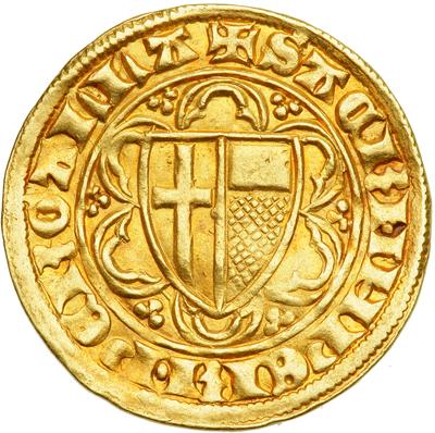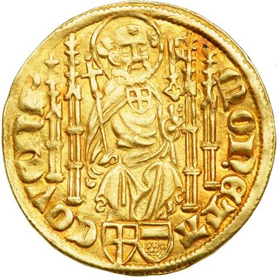 German States - Trier. Goldgulden, ND. Fr-3399. 3.49 grams. 21.49mm. Coblenz mint (1382-1385). Kuno, Archbishop, 1362-1388. Obv: St. Peter seated in a Gothic arcade with two coats of arms at his feet and crossed scepter, right and keys left. Leg: MONETA - COVENS. Reverse: Same coats of arms in one shield with hexafoil in lys of hexafoil. Leg: +SACRI.IMPERI.PERGALLA. NGC graded AU-50.