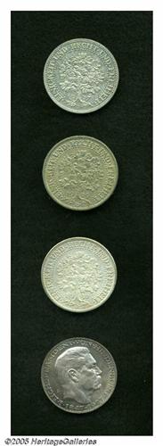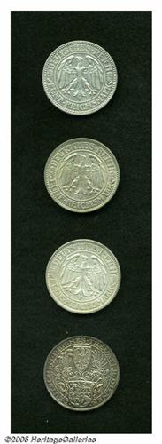 <B>Weimar Republic. 5 Mark Oaktree - Trio; </B></I>KM56, 1927-J, XF lightly cleaned; 1929-D, toned XF-AU; and 1932-J, lightly toned XF; plus Von Hindenburg 5 Mark Medal 1927-D, KM-M1, toned UNC. <B>A sold as is, no return lot.</B></I>