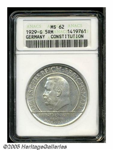 <B>Weimar Republic. Constitution 5 Mark 1929-G,</B></I> KM64, MS62 ANACS. A hint of golden toning and nicer than one might expect of the stated grade. A scarcer mintmark issue of the series.