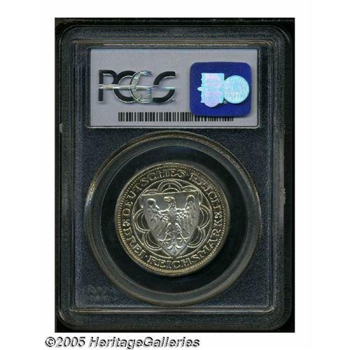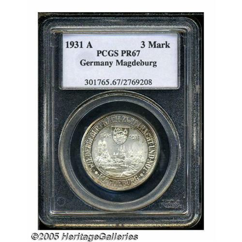 <B>Weimar Republic. Magdeburg 3 Mark 1931A,</B></I> KM72, Proof 67 PCGS. Fully frosted devices with scattered peripheral toning.