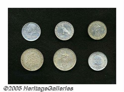 <B>Weimar Republic. Mixed 3 and 5 Mark lot consisting of:</B></I> Rhineland 3 Mark 1925-D, KM46, toned AU; Lessing 3 Mark 1929-G, KM60, XF; Constitution 3 Mark 1929-A, KM63, AU; Liberation of Rhineland 3 Mark 1930-D, KM70, XF; Rhineland 5 Mark 1925-A, KM47, AU; and an Oak Tree 5 Mark 1928-A, KM56 XF. <B>A sold as is, no return lot.</B></I> From the Dr. Kurt Peters Collection.