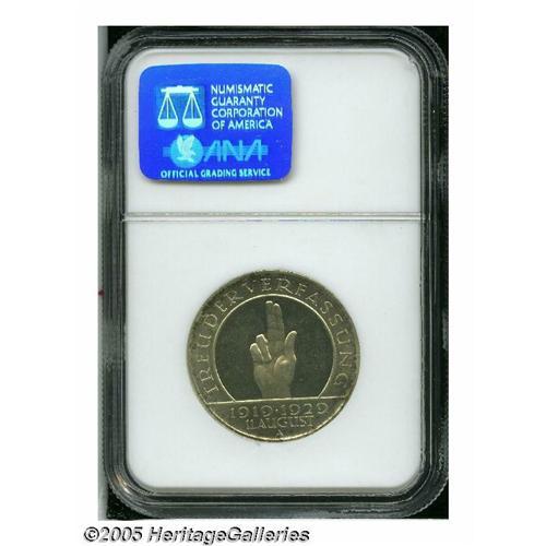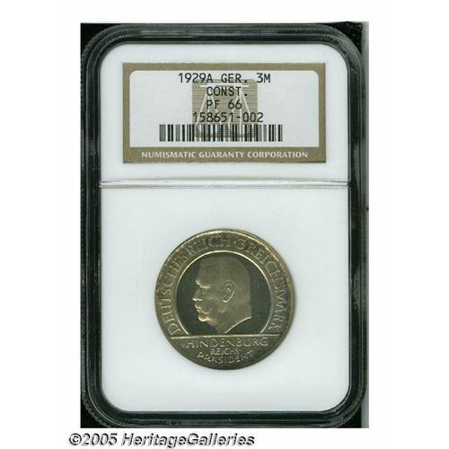 <B>Weimar Republic. Weimar Constitution 3 Mark 1929A,</B></I> KM63, Proof 66 NGC. Full cameo contrast with light golden toning.
